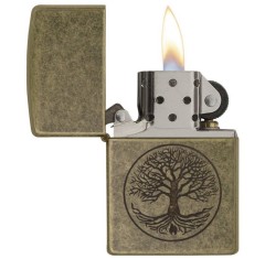Ένα ανεπτυγμένο δέντρο διακοσμεί αυτόν τον αναπτήρα Antique Brass ™ μέσω της διαδικασίας Lustre, με μια μικρή φλόγα Zippo μέσα στις ρίζες του.